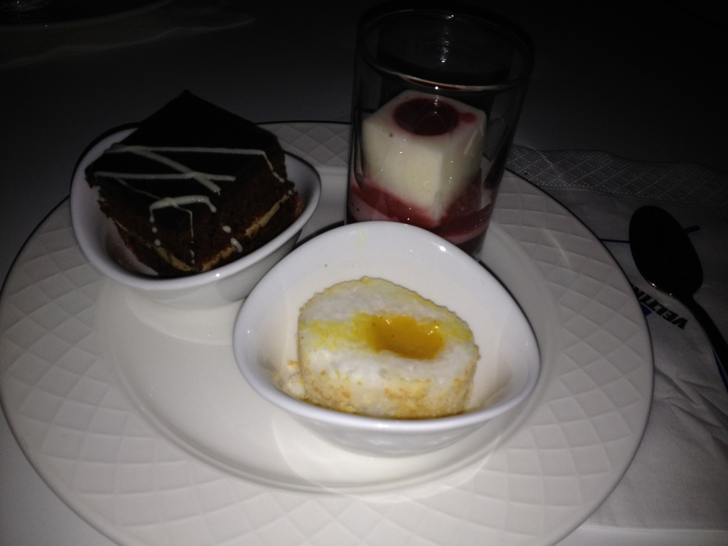 Die Nachspeisen waren in Portionsgläsern und -schüsselchen aufgestellte kleine Kuchen und allerlei Süßspeisen. Das dritte Buffet war in einigen Chafing Dishes vorgehalten. Es gab Schweinefilet und Geflügel-Cordon bleu. Dazu angebratene Drillinge und Gemüse. Keine riesige Auswahl, aber völlig angemessen. Jeder konnte was finden. Geschmacklich war das Schweinefilet eindeutig der Sieger des Abends. Ich musst drei mal zurückkehren und mich davon überzeugen. 😉
