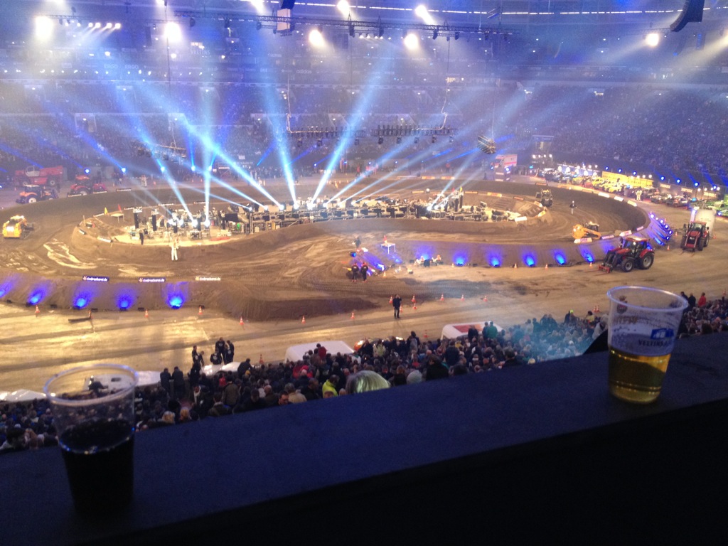 Richtig ernsthafter Motorsport ist das zwar nicht, aber der Spaß den das zuzusehen macht, ist nicht zu unterschätzen. Einige Wochen vorher rief mich ein guter Freund an. Er berichtete, dass er als Gratifikation von Volkswagen zwei Karten für die Veranstaltung bekommen hat. Inklusive Essen und Getränken. Da seine Freundin nicht so die rechte Lust auf verbogenes Blech und schleifende Reifen hatte, durfte ich mit. Ich freute mich wie Bolle. Eine VIP-Lounge verspricht ja immer sehr angenehme Stunden. In Gelsenkirchen angekommen, war das erste Highlight der Parkplatz, der sich wirklich direkt am Stadion befand. Gehstrecke ca. 100m. Man betrat die Stammtischebene und ging zu einem Flur mit einigen Türen. Die letzte gehört Volkswagen. Die moderne Einrichtung war sehr geschmackvoll. Mein Motorsportherz schlug höher als ich einen Pokal des Dakar-Sieges von Volkswagen entdeckte. Hier fühlte ich mich wohl. An der Bar gab es alles was das Herz begehrte. Sehr witzig war übrigens das Detail, das aus jeder Stadt mit einem VW-Werk eine Flasche Wein oder eine Spirituosenspezialität präsentiert wurde.