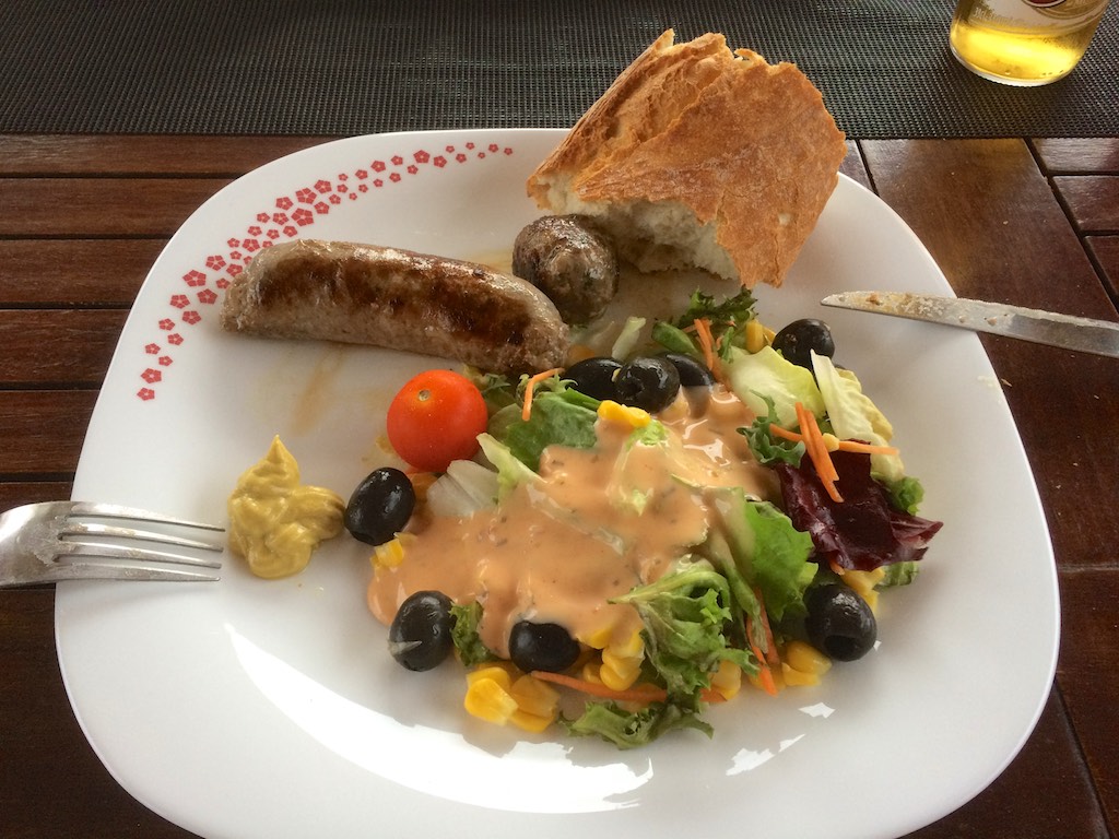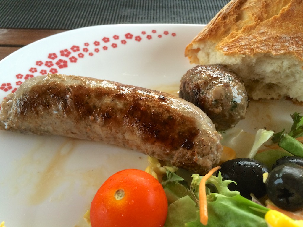 Am Abend haben wir die Wurst und die Fleischbällchen auf einer heißen Stahlplatte über der Glut zubereitet. Die Wurst war gut und lecker, aber der Renner waren die kleinen Frikadellen. Perfekt gewürzt. Mit etwas Brot und Salat einfach ein Genuss.