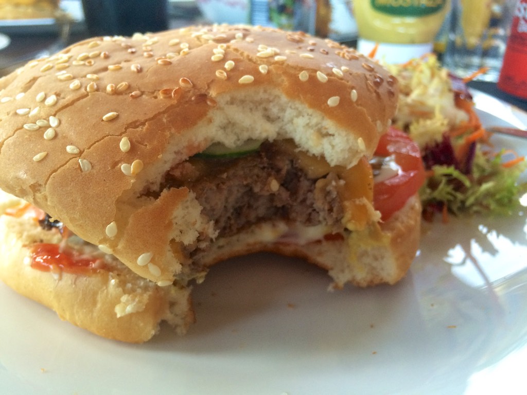 Die Burger am Folgetag standen dem in nichts nach. Ich habe noch nie so einen so perfekt zu grillenden Burgerpatty in den Händen gehabt. Kein Auseinanderfallen, kein Aufblähen. Trotz recht langer Garzeit war das Hackfleisch saftig und lecker. Wenn man selbst Burger macht ärgert man sich häufig, dass man es einfach nicht wie im Restaurant hinbekommt. Das war definitiv anders. Der Burger war fast perfekt. Das lag definitv am guten Ausgangsprodukt. Kurz vor dem Garende etwas Cheddar drauf und ab auf das Brötchen. Salat und Soßen dazu. Fertig! Die Merguez hat auch gehalten, was man erwartet hat. Eine sehr würzige, saftige, grobe Bratwurst. Einfach lecker.